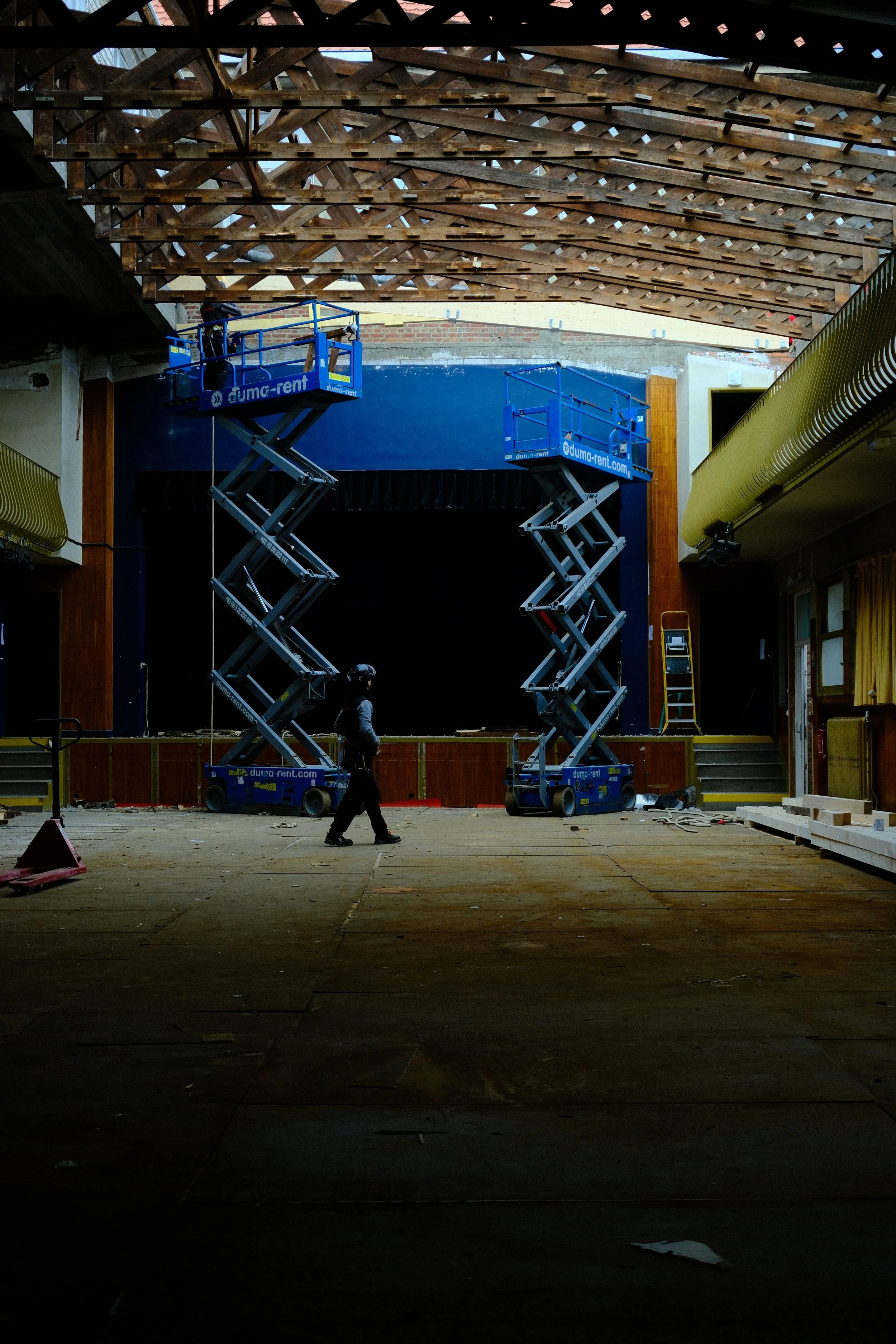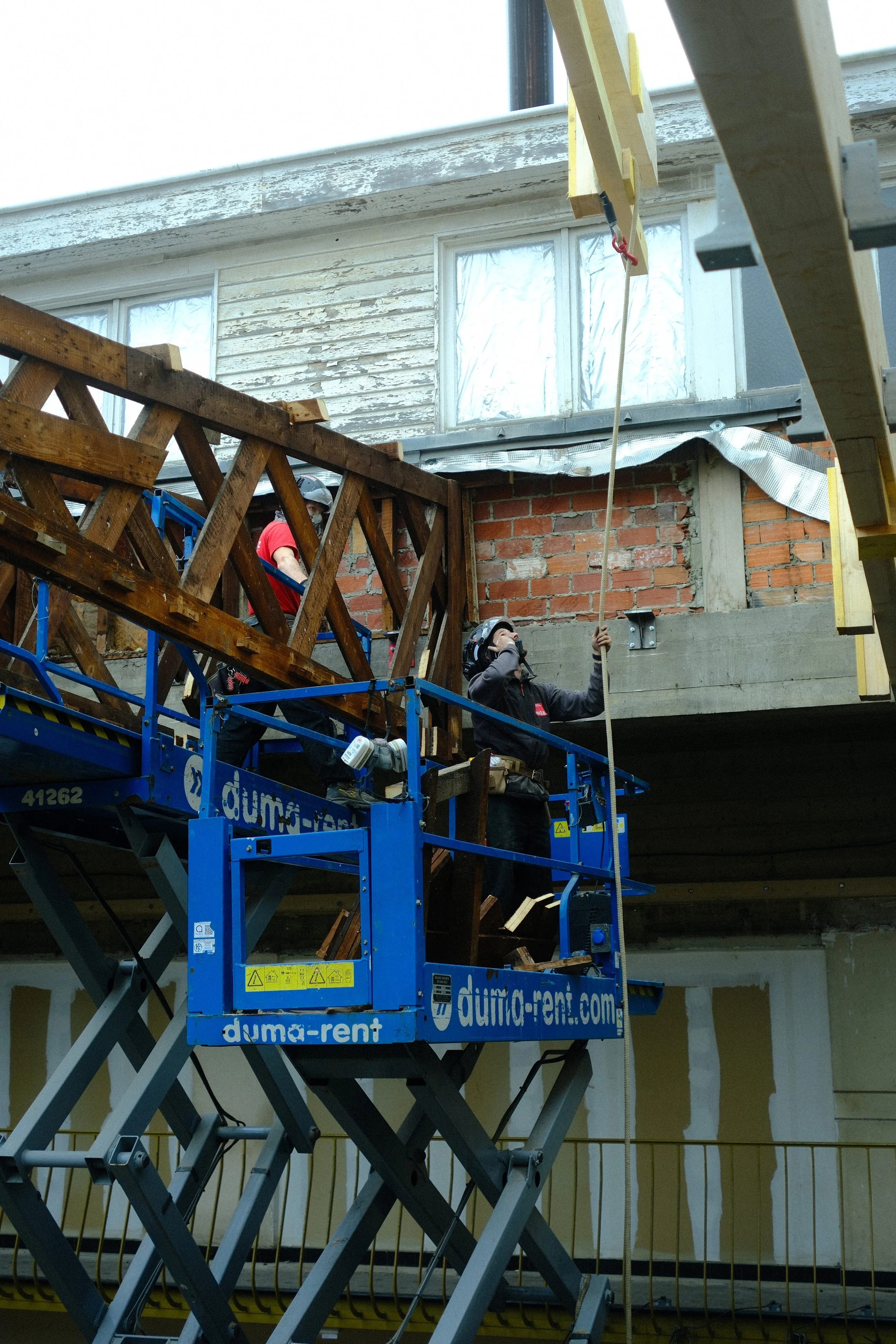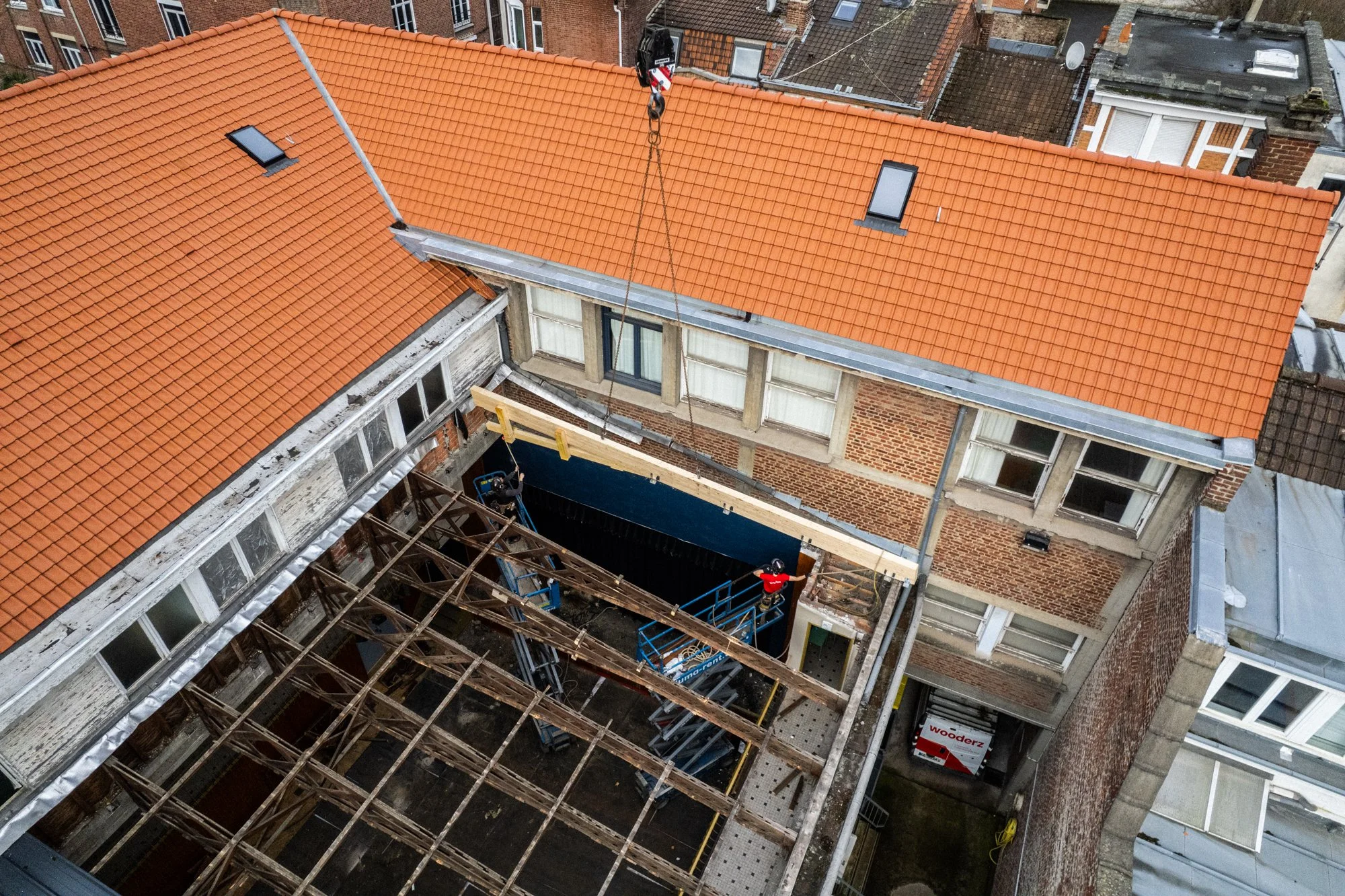 Les éléments de charpente ont été levés et positionnés à la grue, puis ajustés par les équipes Wooderz depuis des nacelles élévatrices. Progressivement, la nouvelle structure a été mise en place au-dessus du bâtiment.