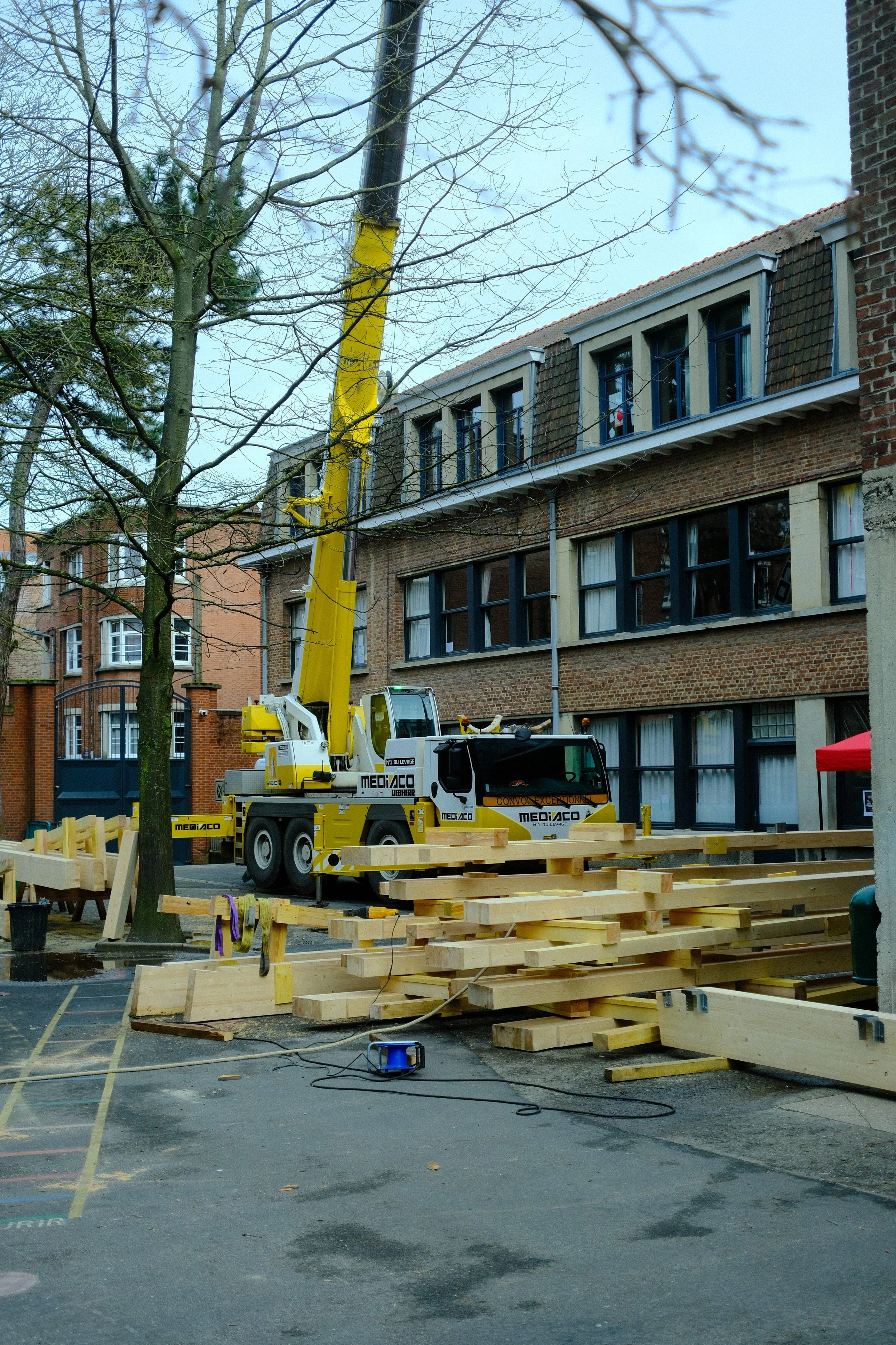Le chantier s’est déroulé dans la cour intérieure de l’établissement scolaire, un environnement qui demandait une organisation logistique adaptée.