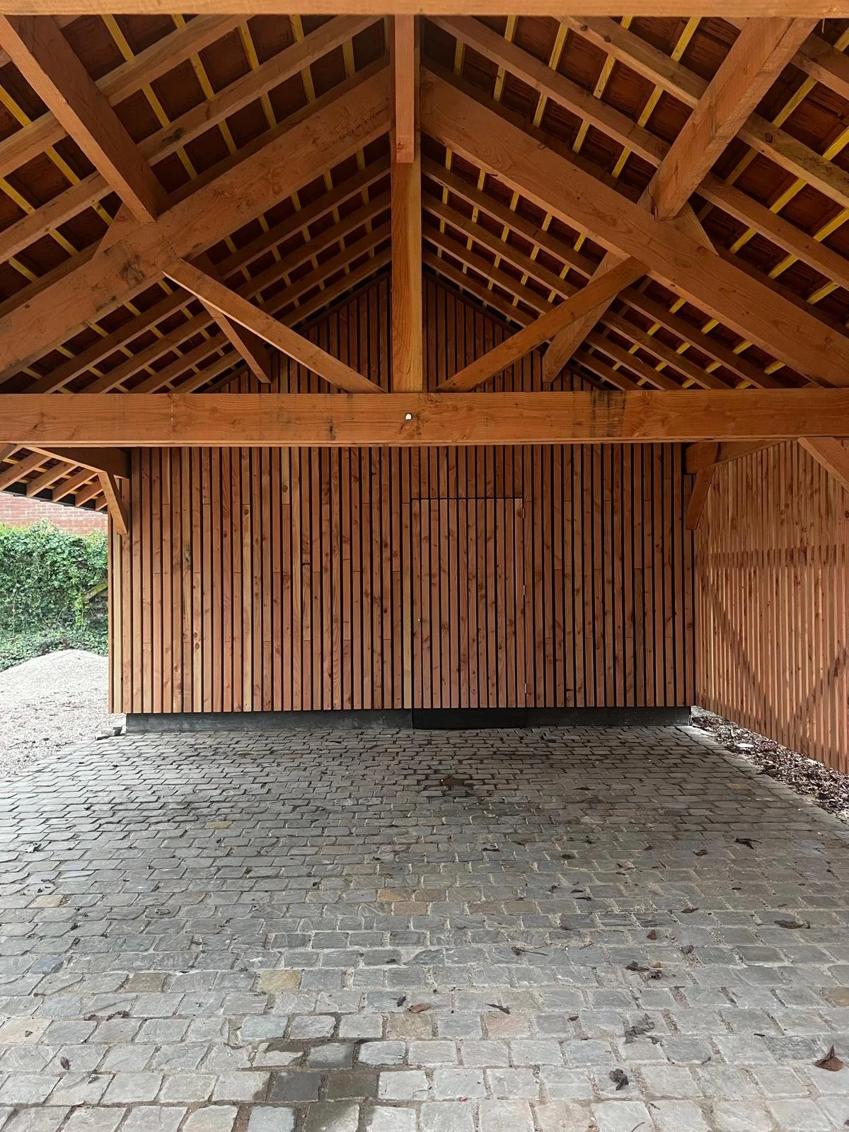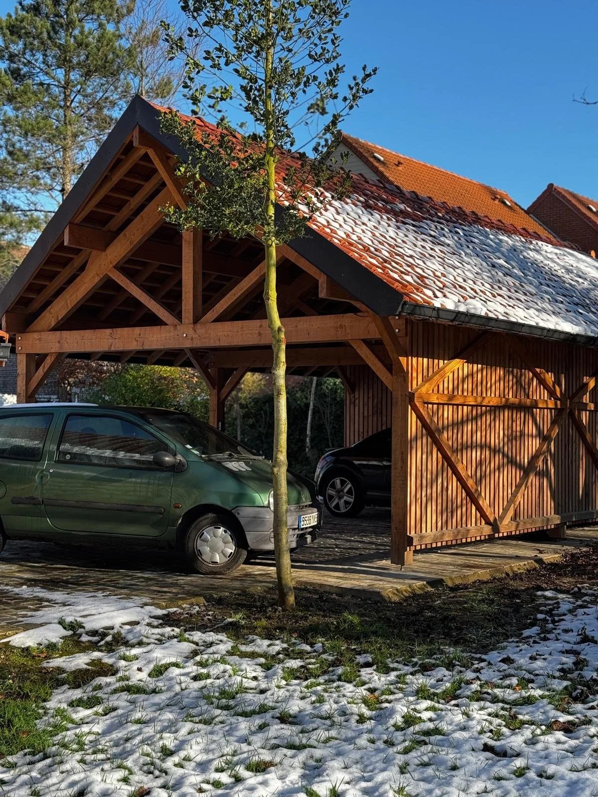 Le carport repose sur une charpente en bois massif Douglas, conçue selon des principes traditionnels : assemblages à mi-bois, contreventements visibles et proportions harmonieuses.
